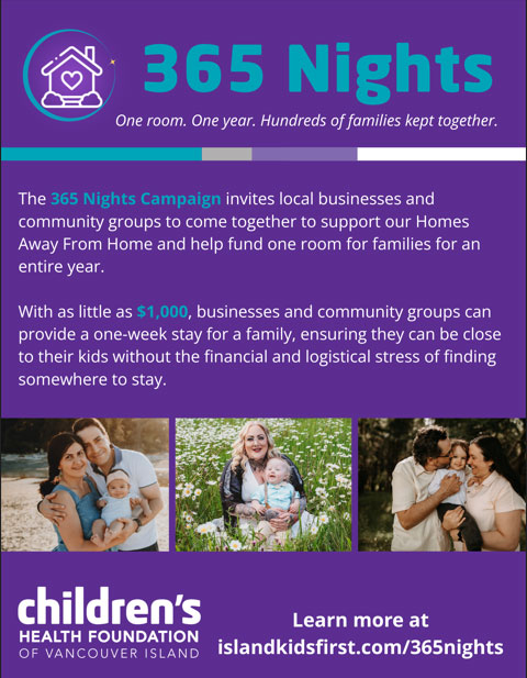 Children’s Health Foundation of Vancouver Island is a 100% donor-funded charity that supports Island kids with complex health challenges. Their programs reduce barriers to accessing health care – both in terms of cost and distance. The Foundation’s Homes Away From Home, Jeneece Place in Victoria and Q̓ʷalayu House in Campbell River, provide welcoming, low-cost accommodation for families to stay next to the hospital while their child receives care.